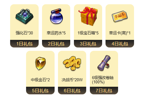迎新礼包:1级随机宝石*3、决战币*30万、强化石*20、灵魂卡片*2